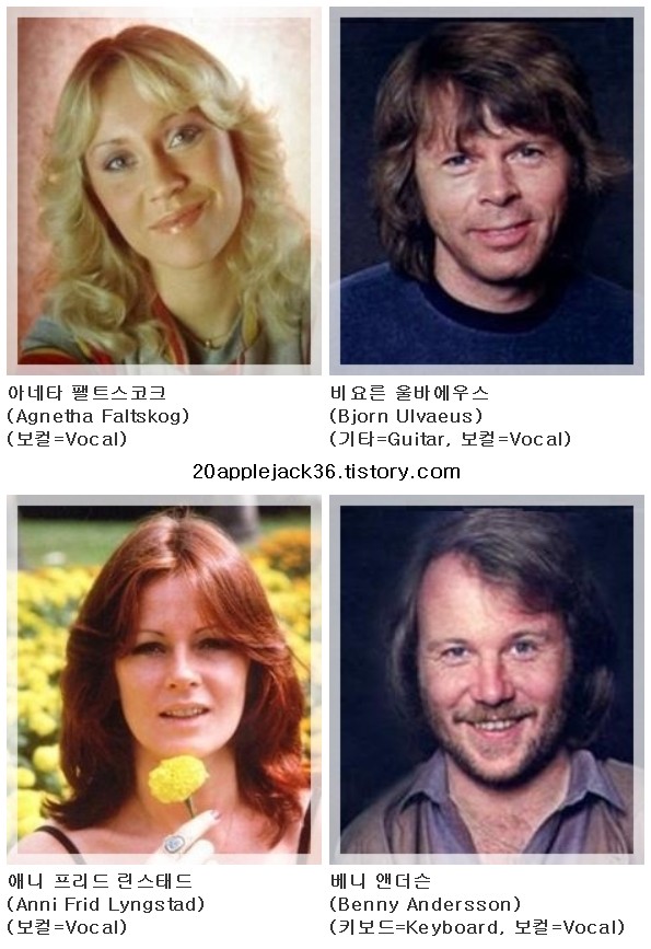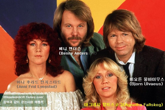 | 1971년에는 '앤드루 로이드 웨버(Andrew Lloyd Webber)'의 '뮤지컬(Musical) ’지저스 크라이스트 슈퍼스타(Jesus Christ Superstar)'에서 '막달라 마리아(Magdala Maria)'역을 맡아 《I Don't Know How to Love Him》을 '히트(Hit)' 시키기도 했습니다. 비슷한 시기에 '베니(Benny)'는 역시 다양한 음악 활동을 하고 있던 '노르웨이(Norway)' 태생의 '애니프리드(Anni Frid:1945년 11월 15일 생)' 를 만납니다. 그녀는 10대 시절 '애니프리드 포(Anni Frid Four)'라는 '댄스 그룹(Dance Group)'을 결성하여 1967년 TV의 '콘테스트(Contest)'에서 입상한 경력을 가지고 있었습니다. 두 남자들과 자연스럽게 팀을 이루게 된 '아네타(Agnetha)'와 '프리드(Frid)'는 1970년, '베니(Benny)'와 '비요른(Bjorn)'의 앨범《Happiness》에 수록되는 '히트 싱글(Hit Single)'《Hej Gamle Man(Hey Old Man)》에 '배킹 보컬(Backing Vocal)'로 참여하게 되었으며, 그리고 이듬해에 '비요른(Bjorn)'과 '아네타(Agnetha)'는 결혼을 했습니다. 1972년 6월, '비요른(Bjorn)', '베니(Benny)', '아네타(Agnetha)'와 '프리드(Frid)'라는 이름으로 발표된 싱글 《People Need Love》는 큰 '히트(Hit)'를 기록했고 이 즈음부터 '매니저(Manager)'인 '스틱 앤더슨(Stig Anderson)'은 '그룹(Group)'을 '멤버(Member)' 들의 '이니셜(Initial)'을 딴 이름인 ‘아바(ABBA)’로 부르기 시작했습니다 |